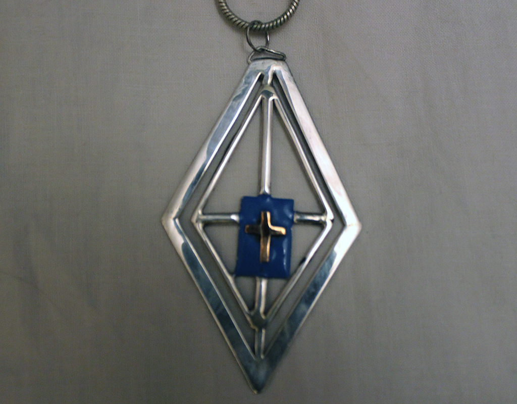 Diamond design with bronze cross on an EF enamelled, (finely-ground glass and coloured pigment), background.