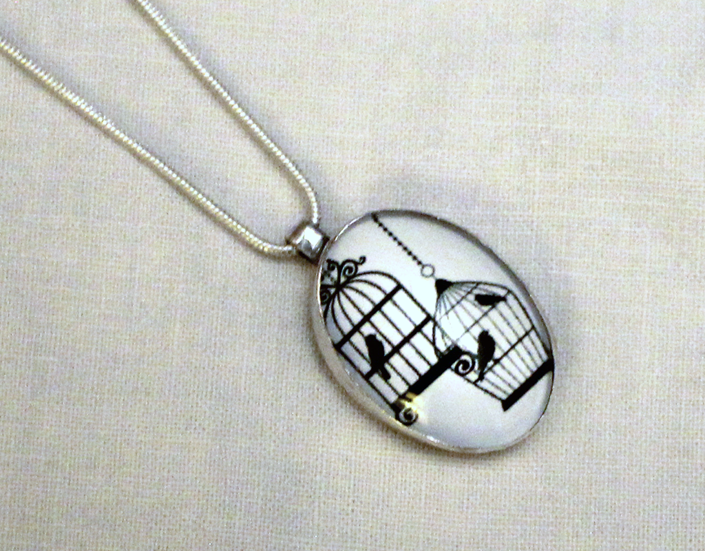 Cabochon with two bird cages in black on a white background, bezelled and hung as a pendant on a snake chain.