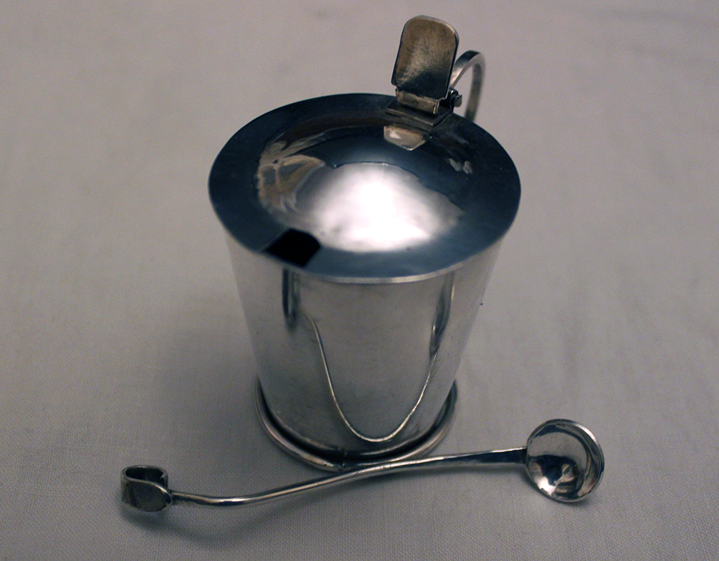 Mustard or sauce pot with spoon, hallmarked at London (Intermediate student project).
